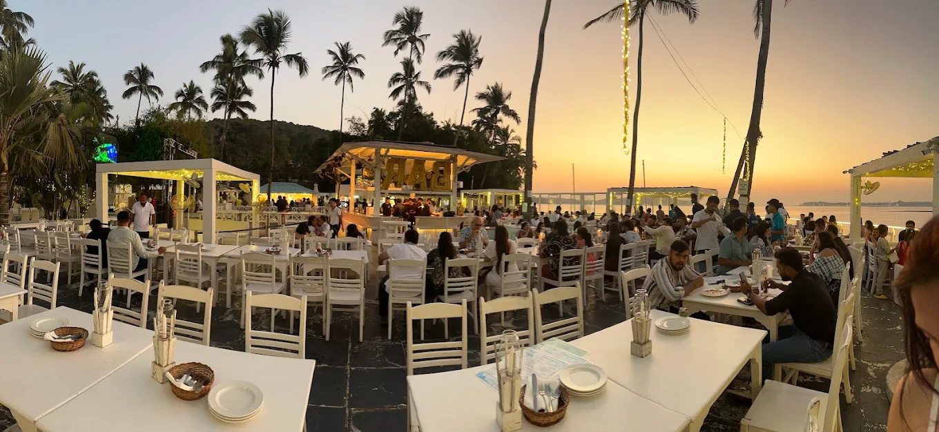 If you’re looking for a romantic evening, Thalassa is unmissable. Located on a cliffside in Siolim, it offers breathtaking views of the Chapora River and the Arabian Sea – perfect for watching the sunset.