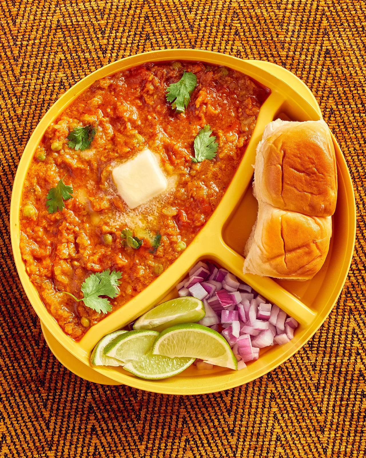 A plate of spiced mashed vegetable curry (bhaji) served with butter-toasted bread rolls (pav) is Mumbai’s number one “comfort food.” Once a quick meal for textile workers, pav bhaji has now spread nationwide, winning hearts across India.