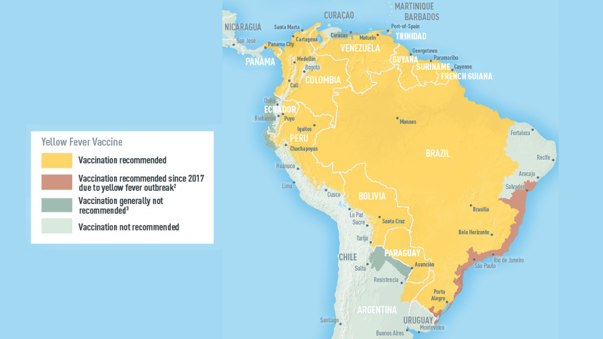 Image: Yellow-marked areas in South America where vaccination is recommended. Source: CDC.
