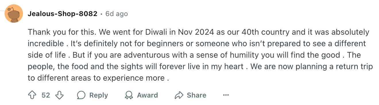 Như một du khách đã chia sẻ: “Ấn Độ không dành cho "tay mơ", nhưng nếu bạn là người thích phiêu lưu và có sự khiêm nhường, con người, ẩm thực và cảnh quan nơi đây sẽ mãi mãi sống trong tim bạn.”