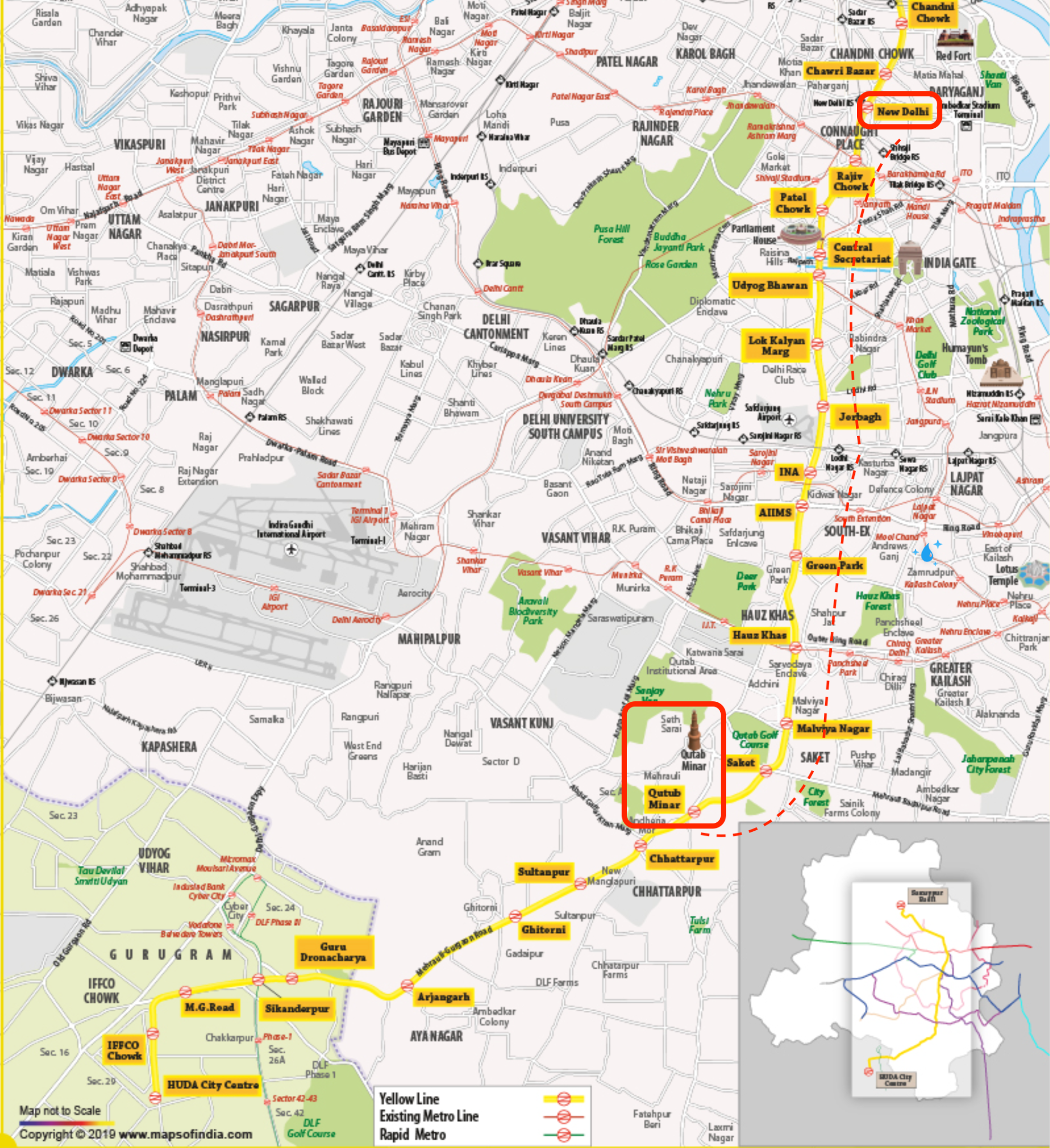 Hình ảnh: Tuyến di chuyển của Metro Yellow Lines tại Ấn Độ. Nguồn: Maps of India