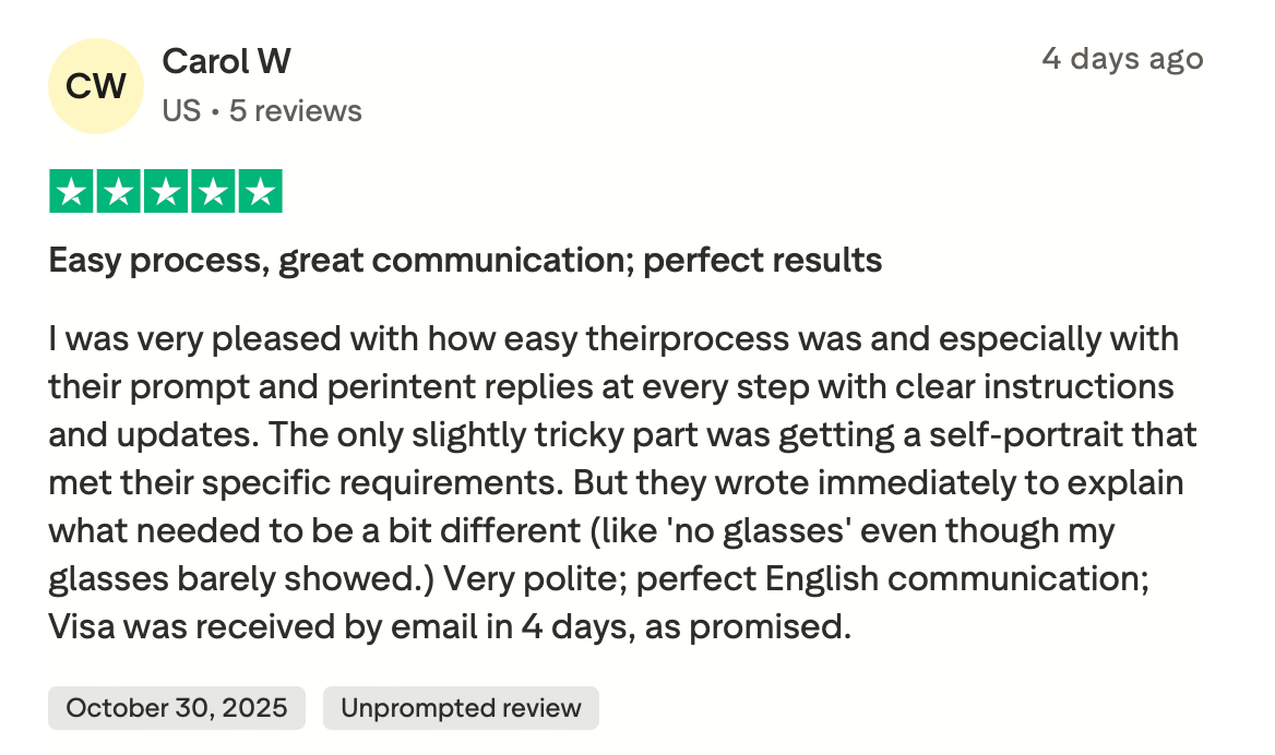 I was very pleased with how easy theirprocess was and especially with their prompt and perintent replies at every step with clear instructions and updates. The only slightly tricky part was getting a self-portrait that met their specific requirements. But they wrote immediately to explain what needed to be a bit different (like 'no glasses' even though my glasses barely showed.) Very polite; perfect English communication; Visa was received by email in 4 days, as promised."